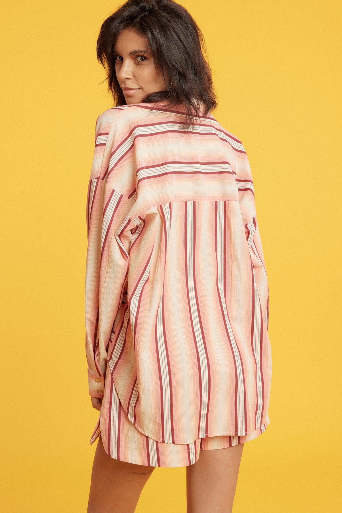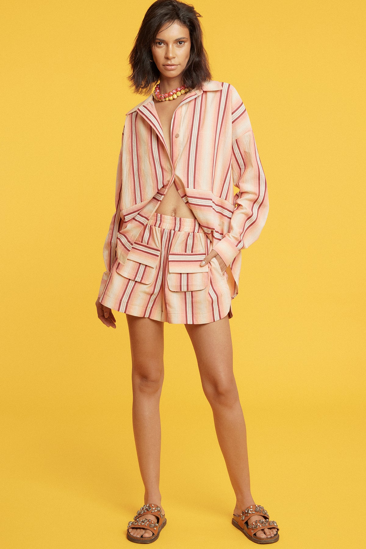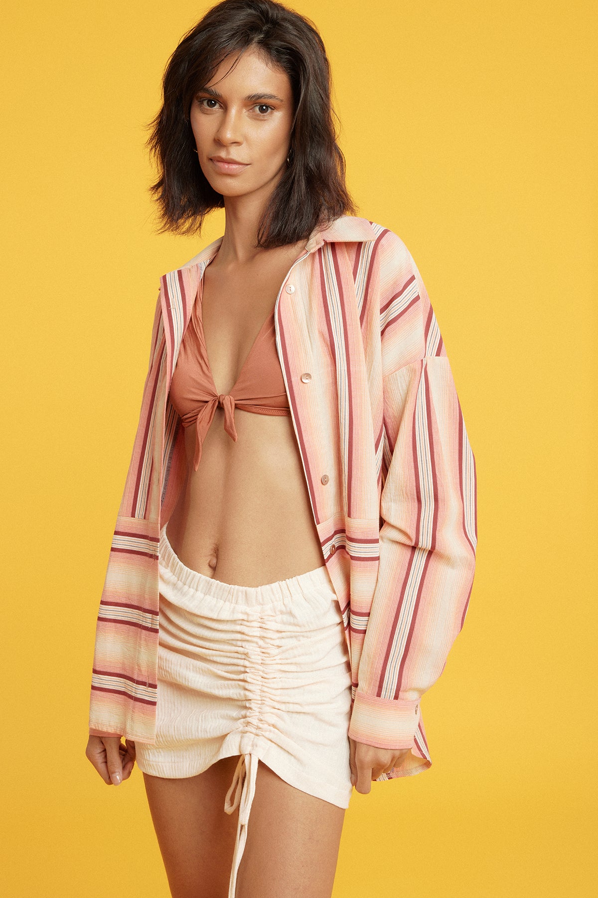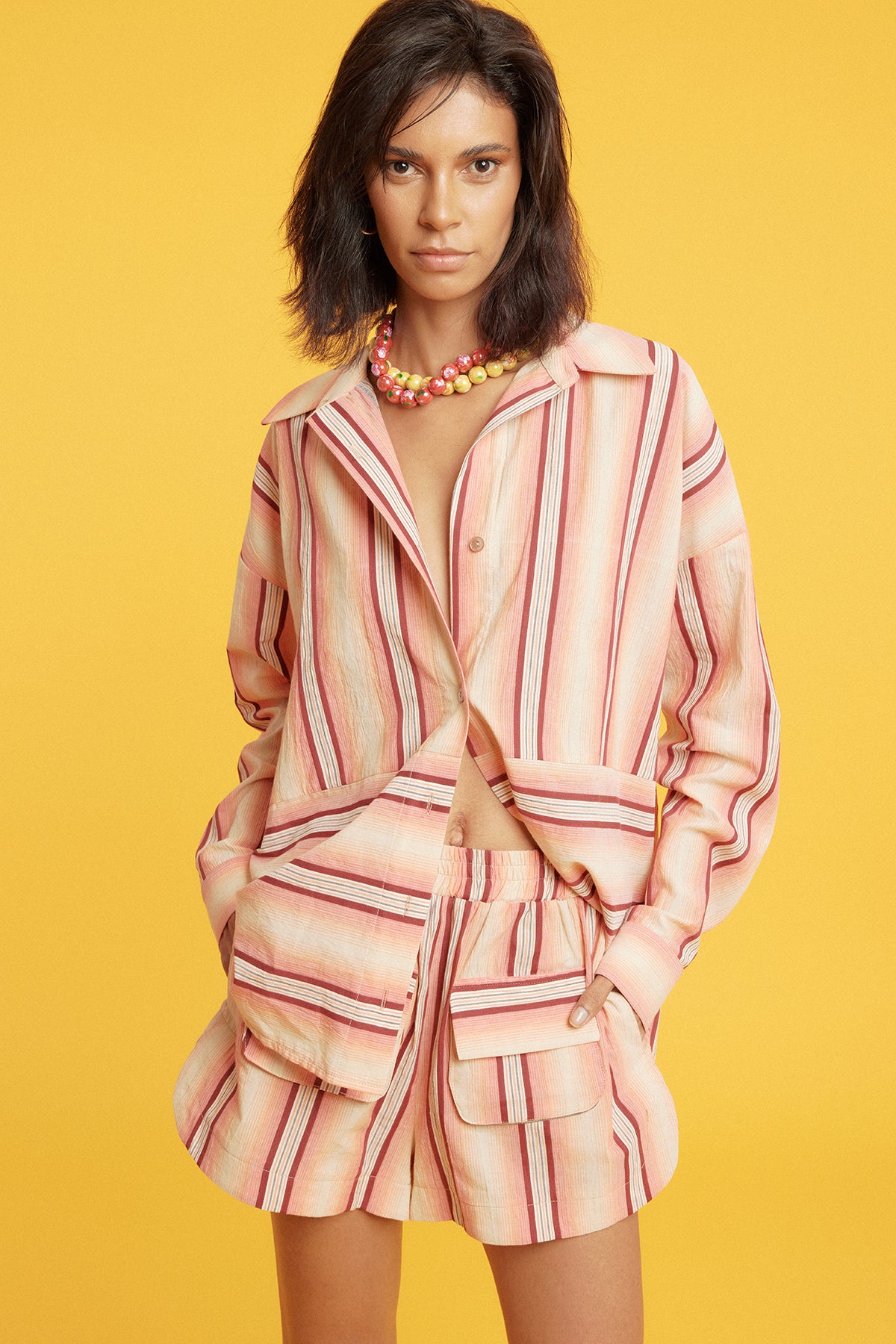 The CABANA shirt features a Souq Samurai signature fit. Designed with dropped shoulder seams to emphasize the boyfriend cut and has real seashell buttons in the same shade of baby-pink.  Different stripe placements give just the perfect amount of illusion. Wear yours with COPA shorts.