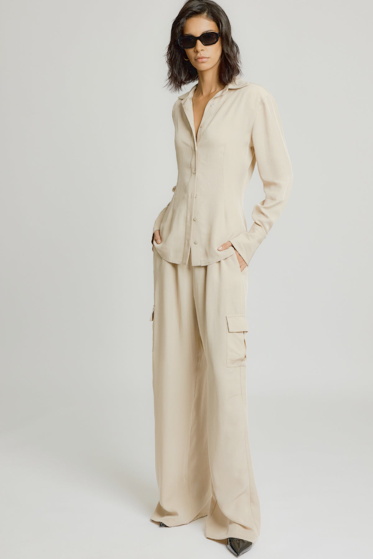 Fitted Shirt with shoulder pads and silky touch. Even better combined with matching trousers.