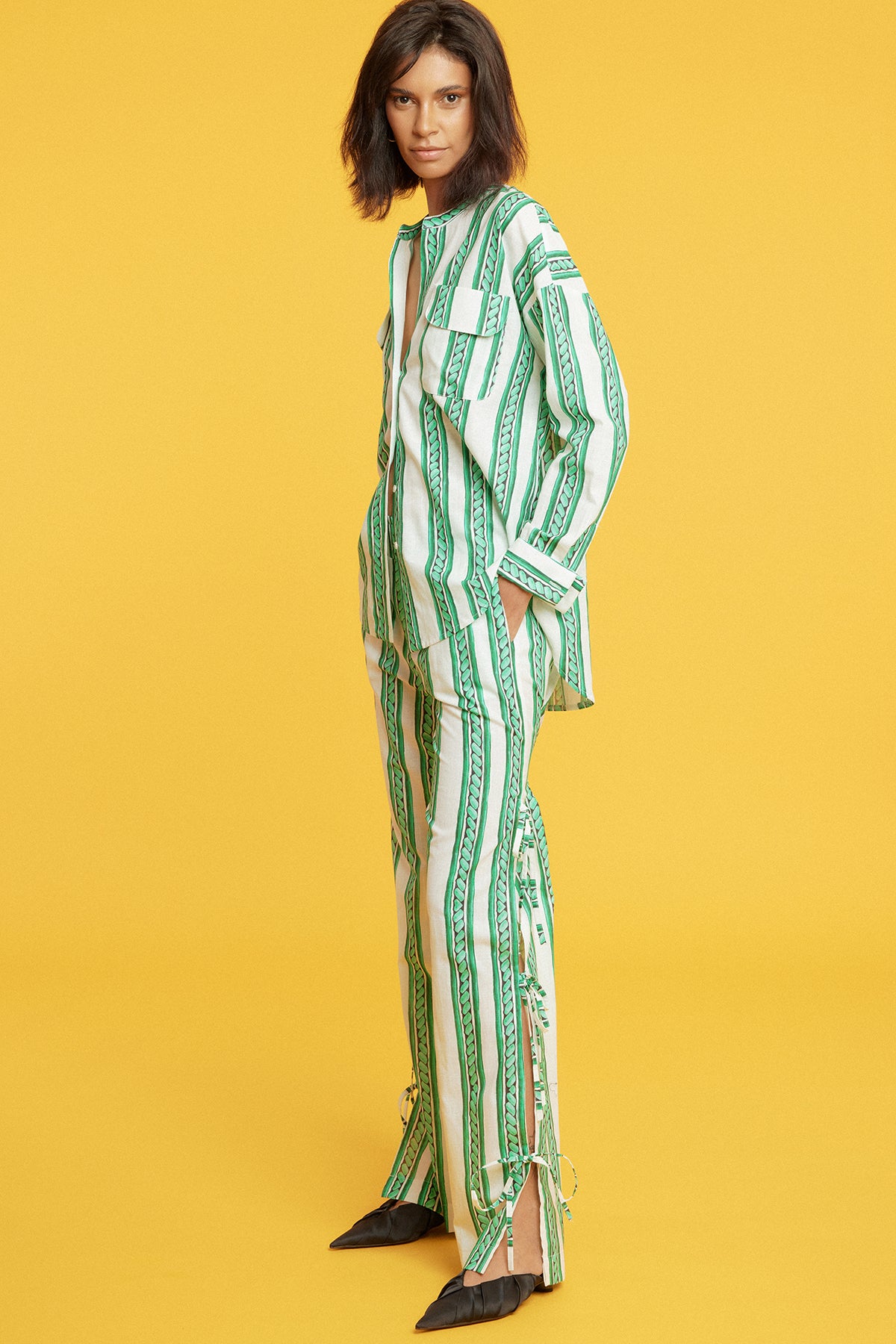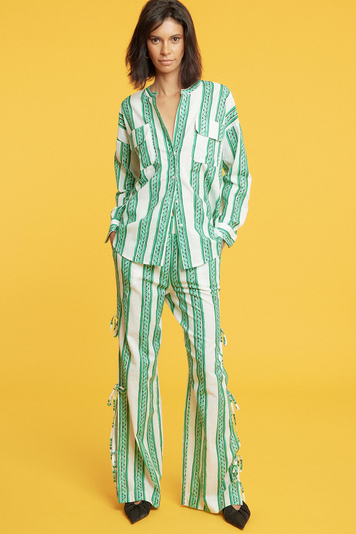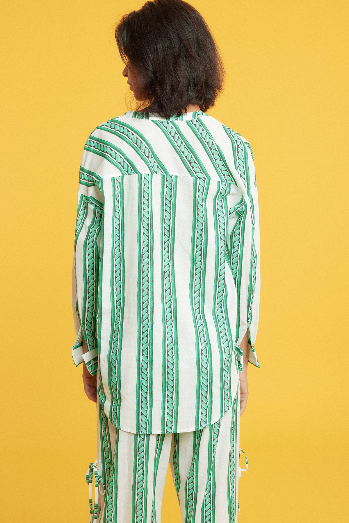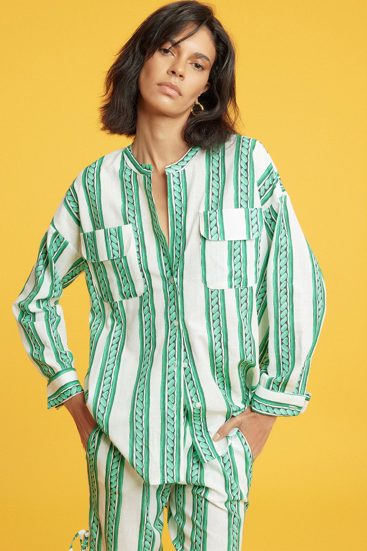 The GRANDOLA shirt features a Souq Samurai signature fit. Designed with dropped shoulder seams to emphasize the loose cut, it has double flap pockets for a relaxed look.   Different stripe placements give just the perfect amount of illusion. Wear yours with matching  CAMPORTA pants.