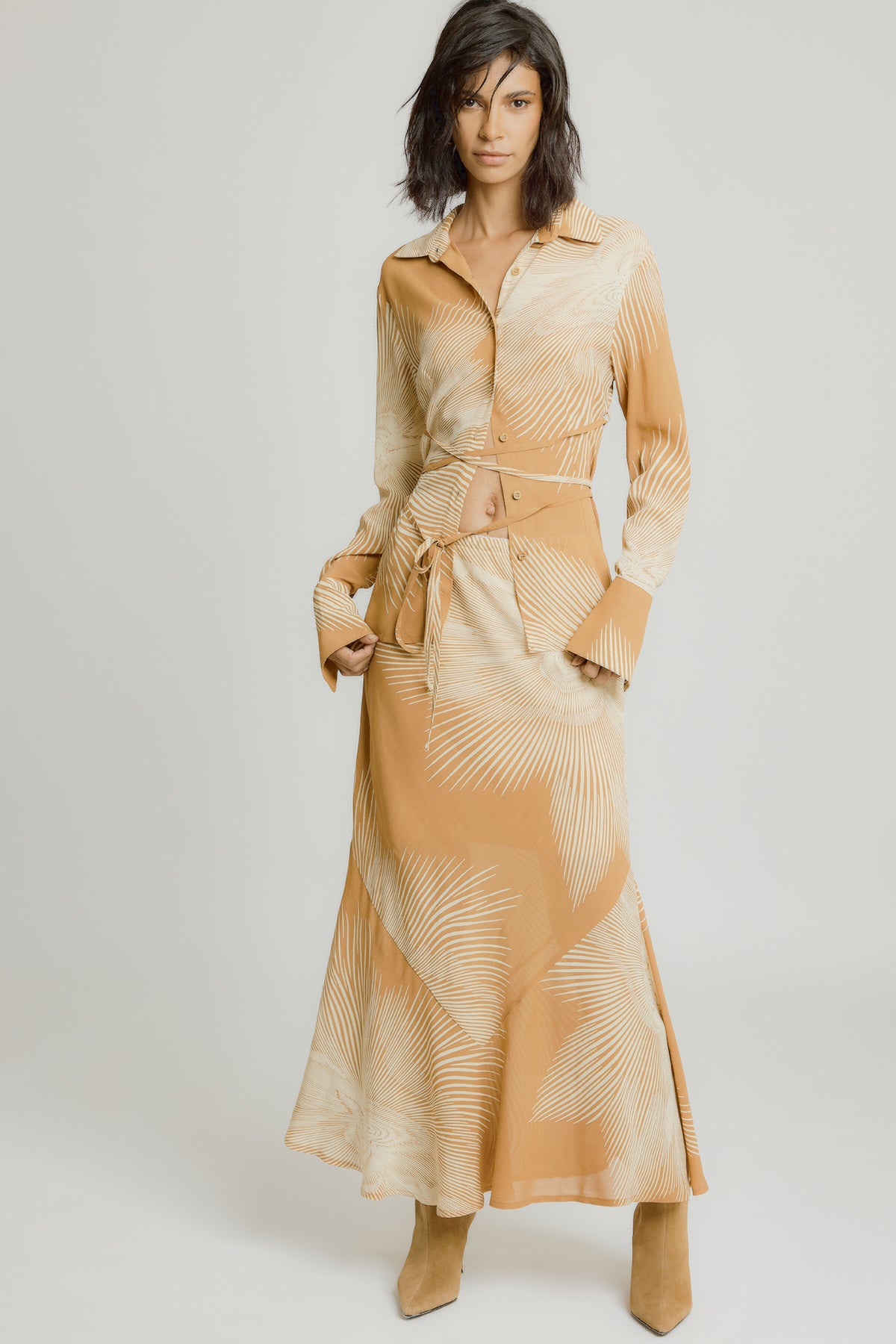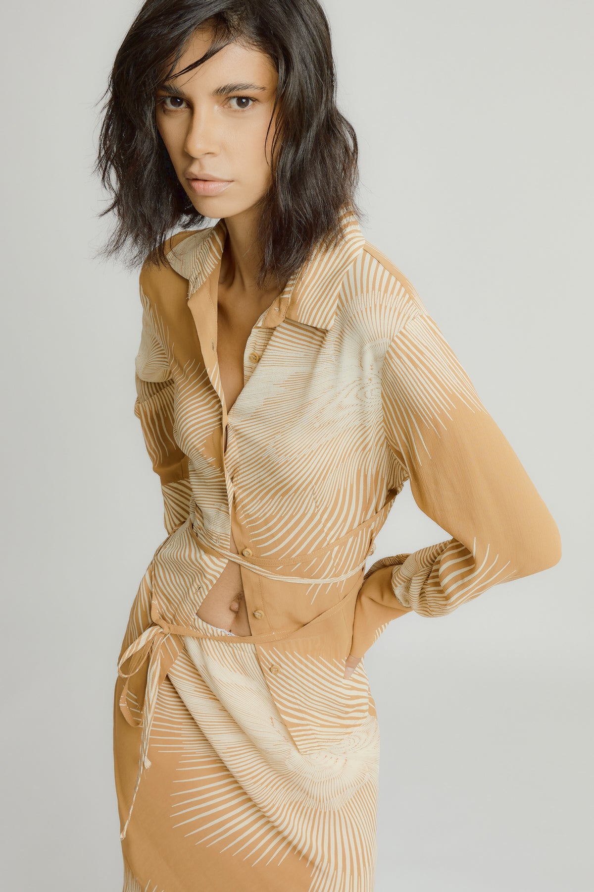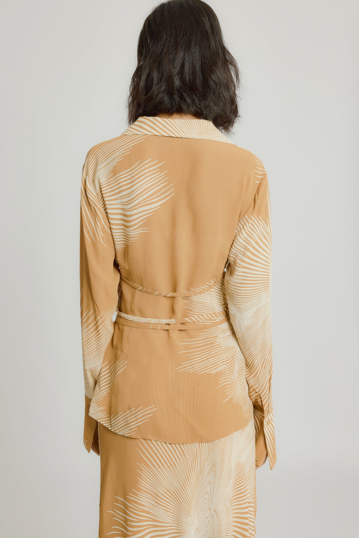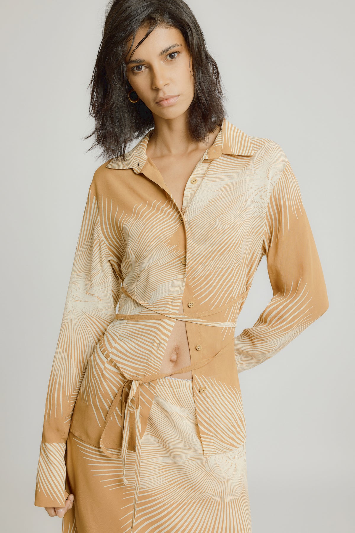 SAHARA shirt with tie details gives you many options to play with. Wear yours tied around your waist loosely or tie it from the back with a more fitted look. Wear yours with a matching SAHARA skirt or SAHARA pants.